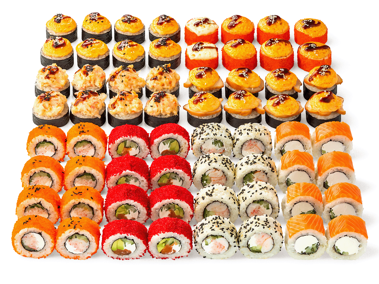 Филадельфия легкая, Калифорния, Калифорния с креветкой, Калифорния с лососем, Запеченный с креветкой, Запеченный с курицей, Запеченный Лосось Унаги, Запеченная Калифорния.