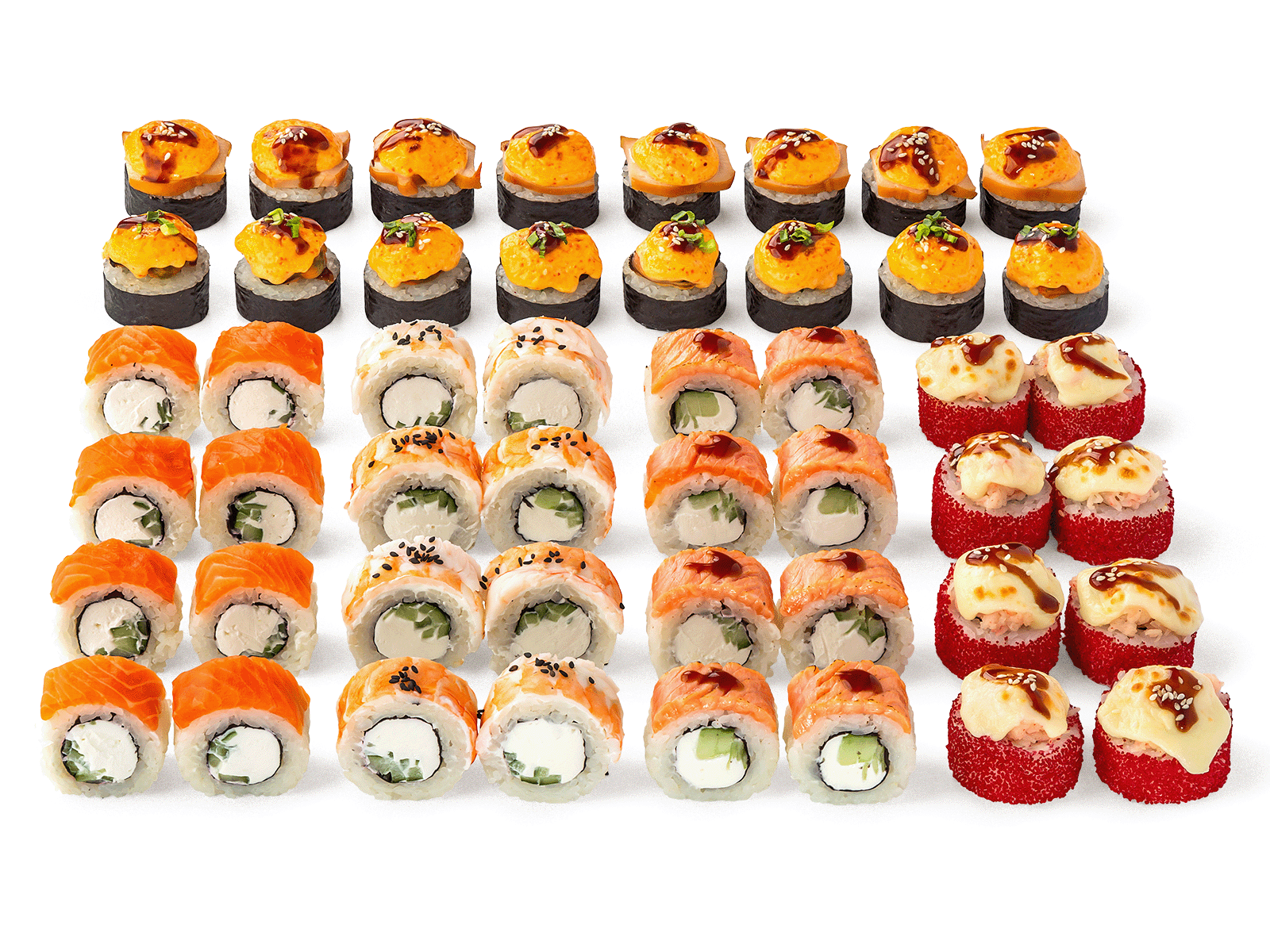 Филадельфия лайт, Филадельфия лайт опаленная, Филадельфия с креветкой, Запеченный с крабом, Запеченный с мидиями, Запеченный с курицей.