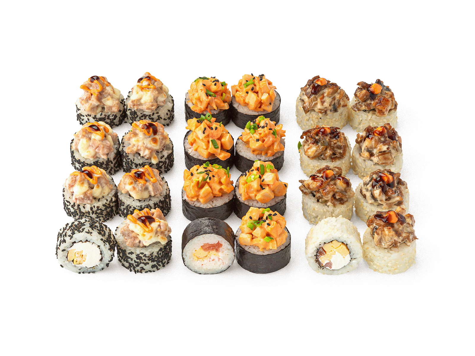 Запеченный ролл с угрем и вешенками, Запеченный ролл с тунцом и моцареллой, Ролл с кальмаром и креветкойСоевый соус, имбирь и васаби не входит в комплект к блюду
