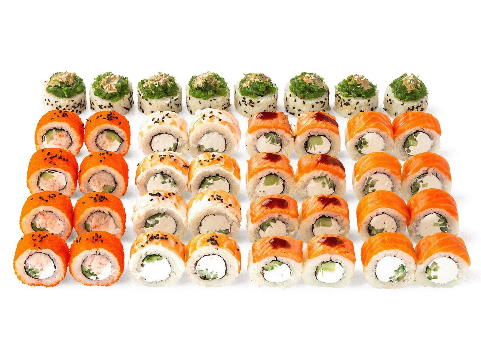 Филадельфия легкая опаленная, Филадельфия легкая, Калифорния, Филадельфия с креветкой, Филадельфия с чукой. Соевый соус, имбирь и васаби не входит в комплект к блюду