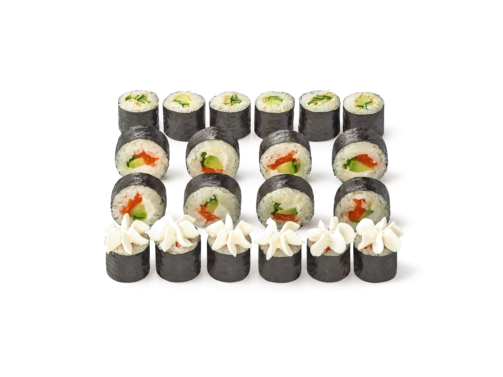 Филадельфия мини, Мини-ролл с огурцом, Мини сливочный лосось. Соевый соус, имбирь и васаби не входит в комплект к блюду