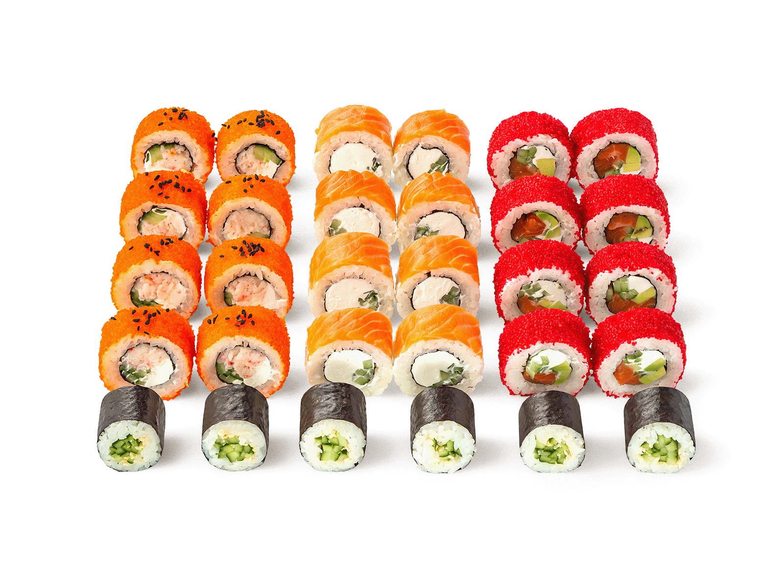 Филадельфия легкая, Калифорния, Калифорния с лососем, Мини-ролл с огурцом. Соевый соус, имбирь и васаби не входит в комплект к блюду