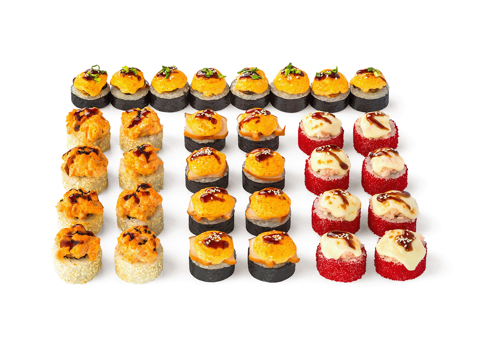 Запечённые роллы: с курицей, с лососем, с мидиями, с крабом.