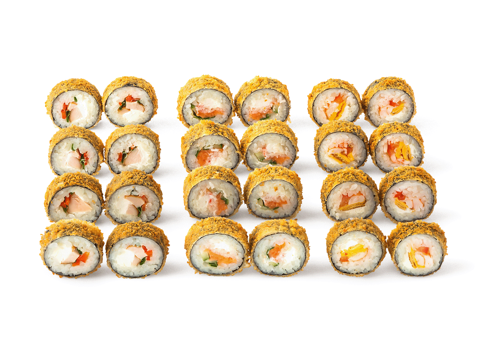 Роллы темпура: с лососем, с курицей, с креветкой.