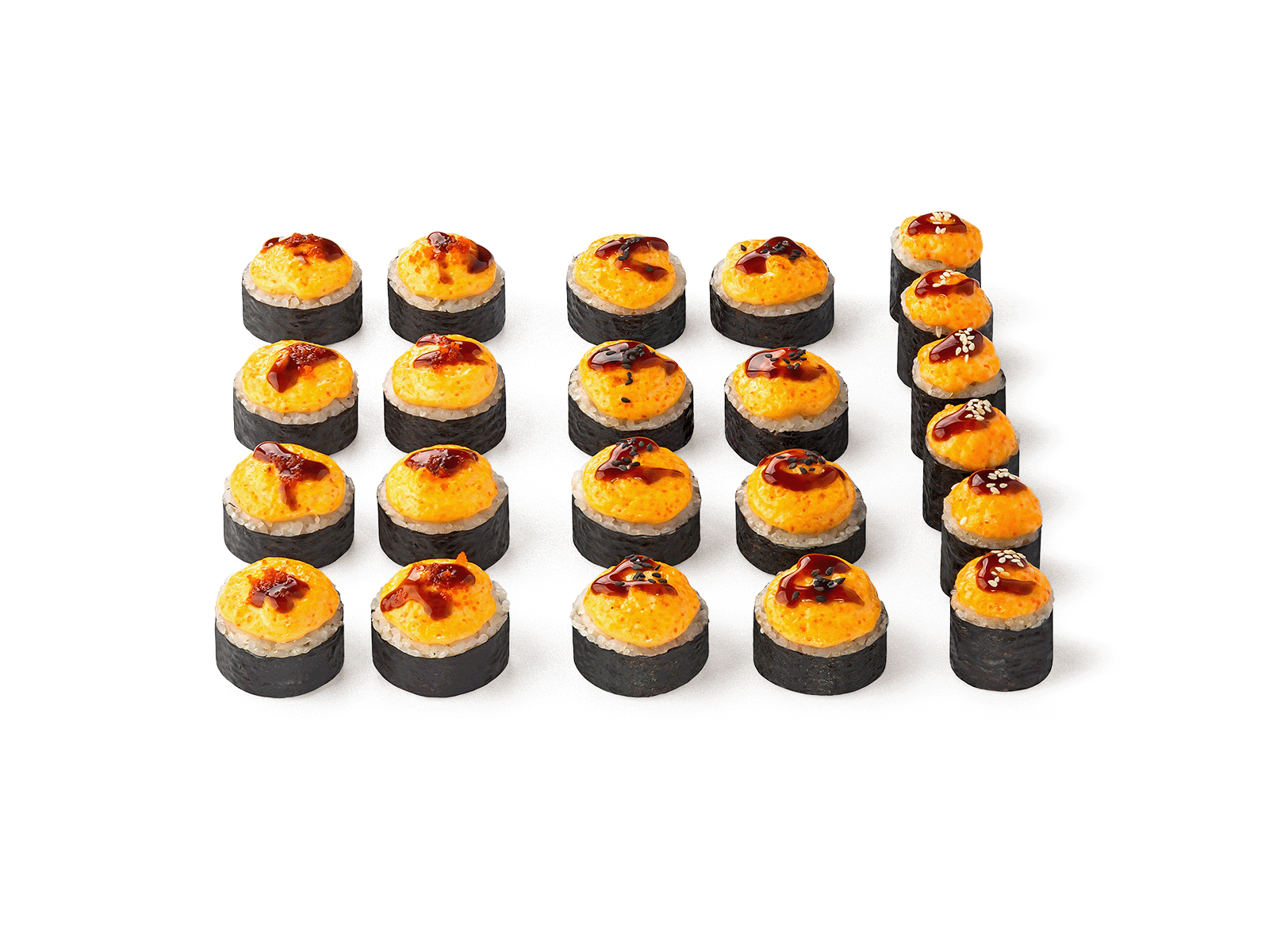 Запеченный краб Унаги, Запеченная креветка Унаги, Запеченный мини-ролл с курицей. Соевый соус, имбирь и васаби не входит в комплект к блюду