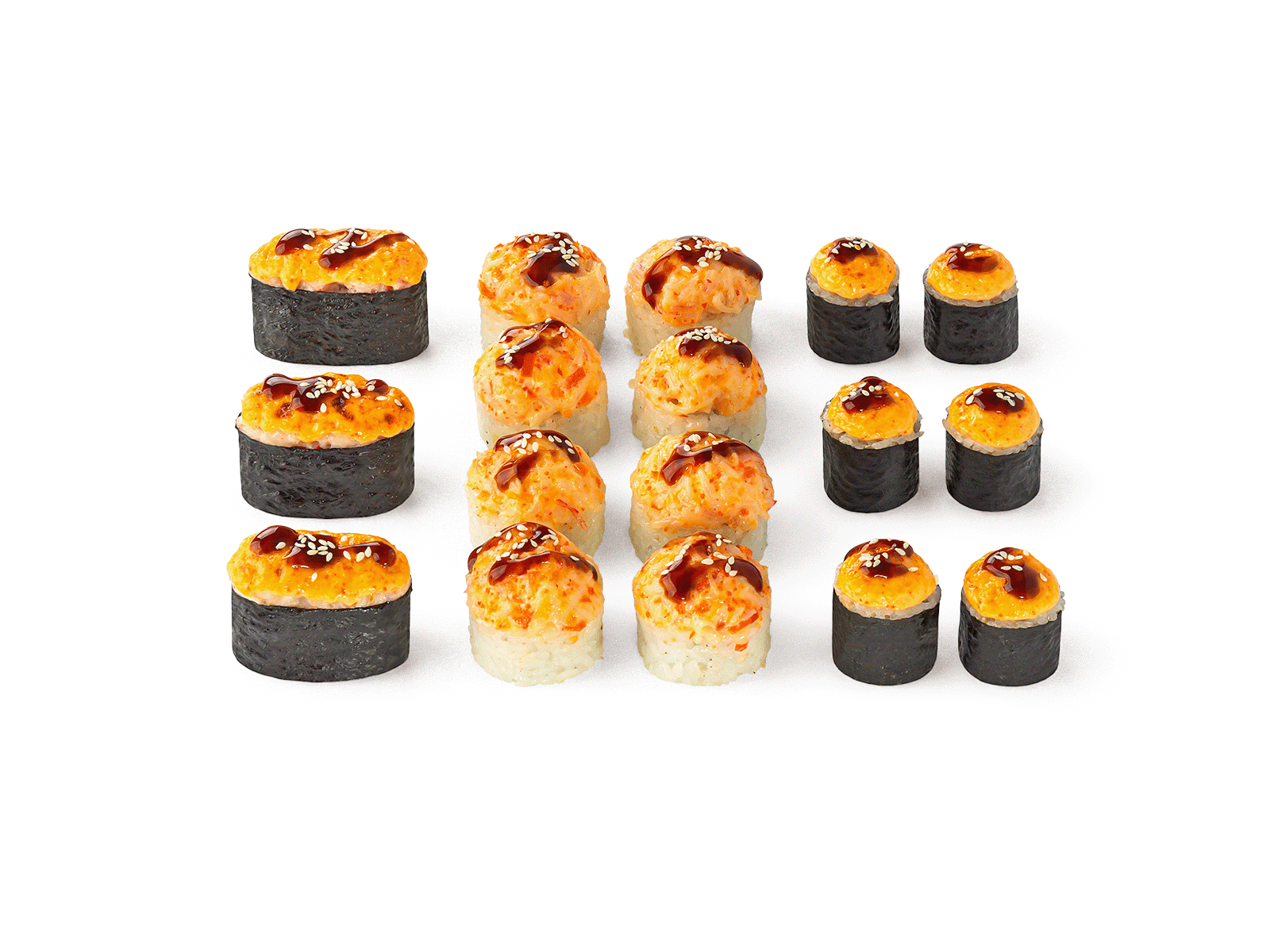 Запеченные: суши с крабом (3 шт.), ролл с крабом, мини-ролл с крабом.