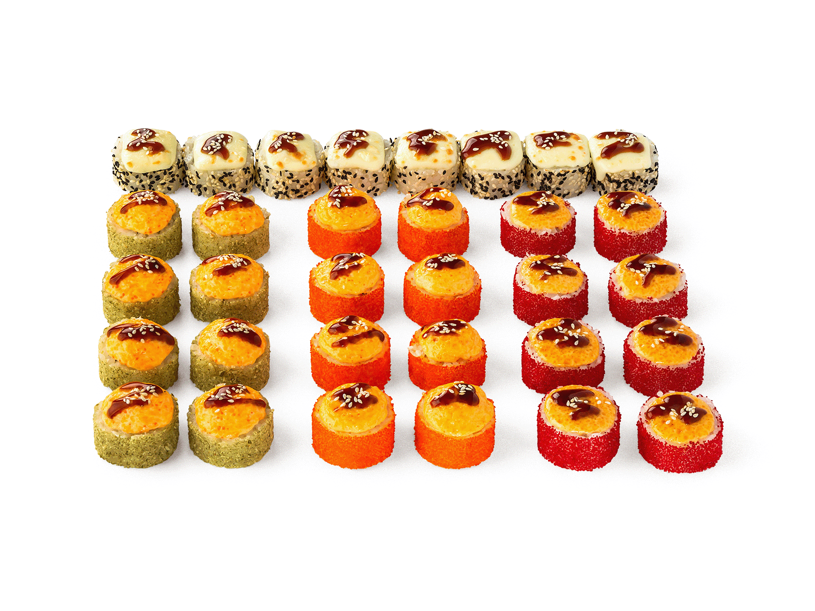 Запеченные роллы Калифорния: под розовым соусом, под спайси соусом, под сырным соусом, под сыром моцарелла. Соевый соус, имбирь и васаби не входит в комплект к блюду