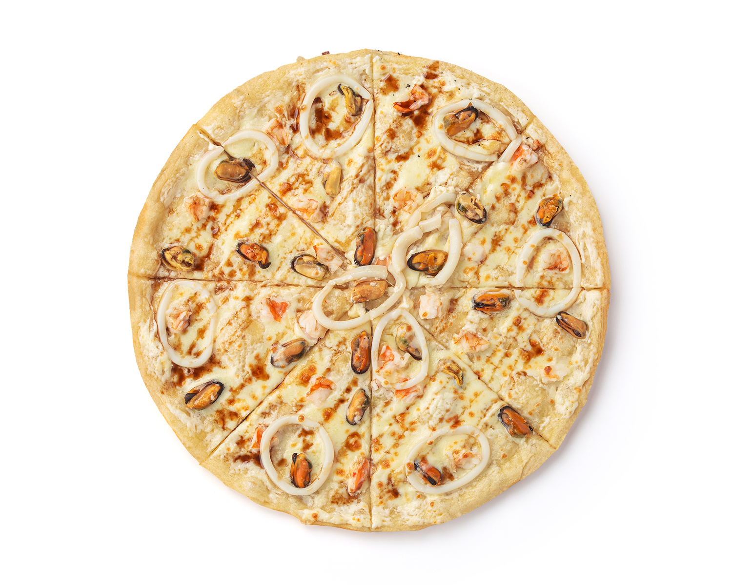 Моцарелла, мидии, тигровые креветки, кальмар, сливочно-чесночный соус, соус унаги (25 см)