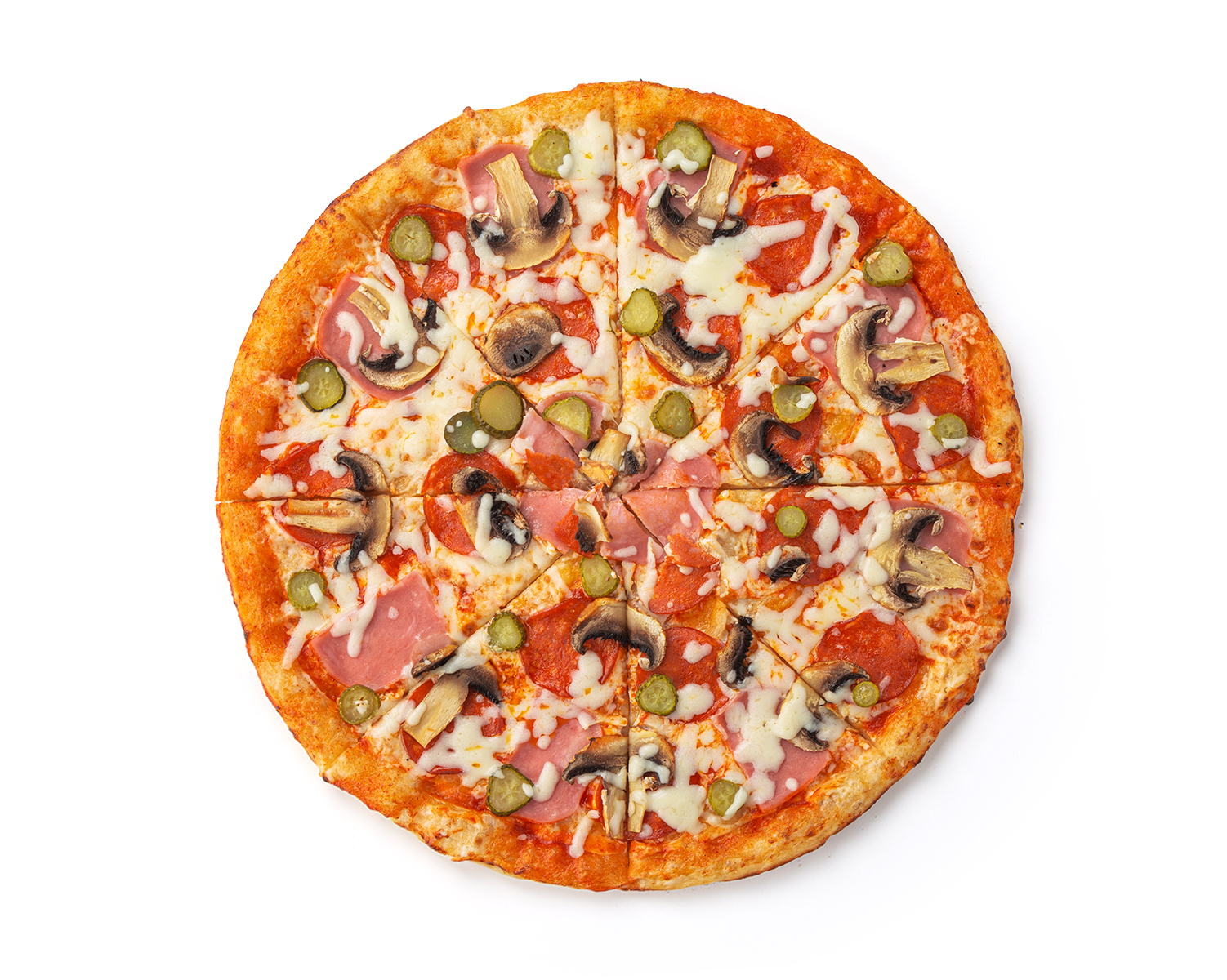 Ветчина, пепперони, шампиньоны, моцарелла, маринованные огурцы, соус барбекю, соус сливочно-чесночный (30 см)
