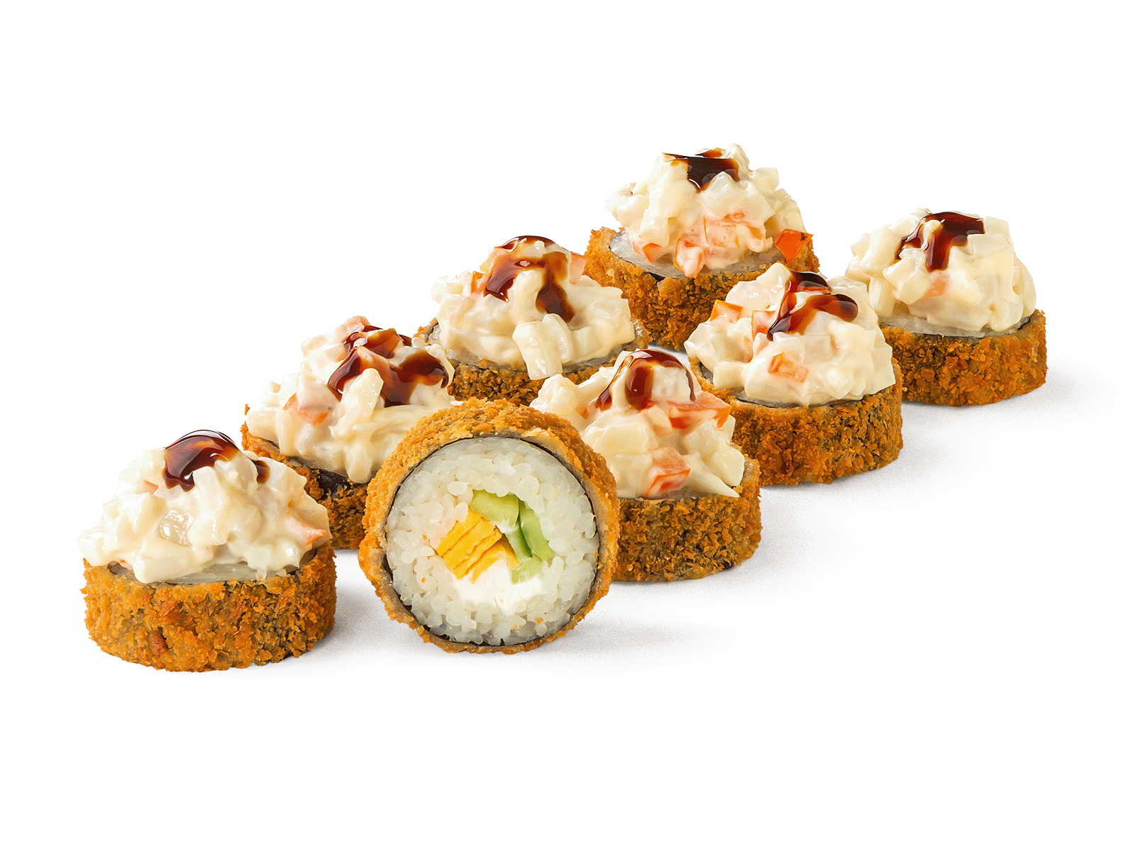 Кальмар, омлет тамаго, огурец, сливочный сыр, томат, соус сливочно-чесночный, соус унаги. Соевый соус, имбирь и васаби не входит в комплект к блюду