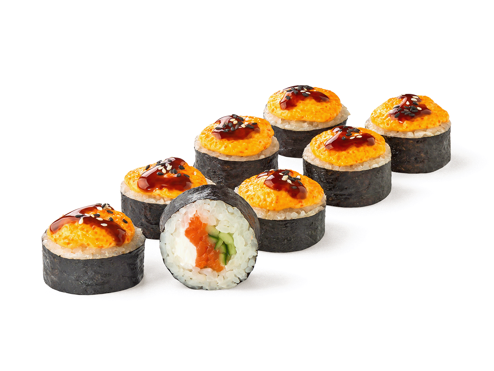 Лосось, сливочный сыр, огурец, розовый соус, унаги-соус, кунжут. Соевый соус, имбирь и васаби не входит в комплект к блюду