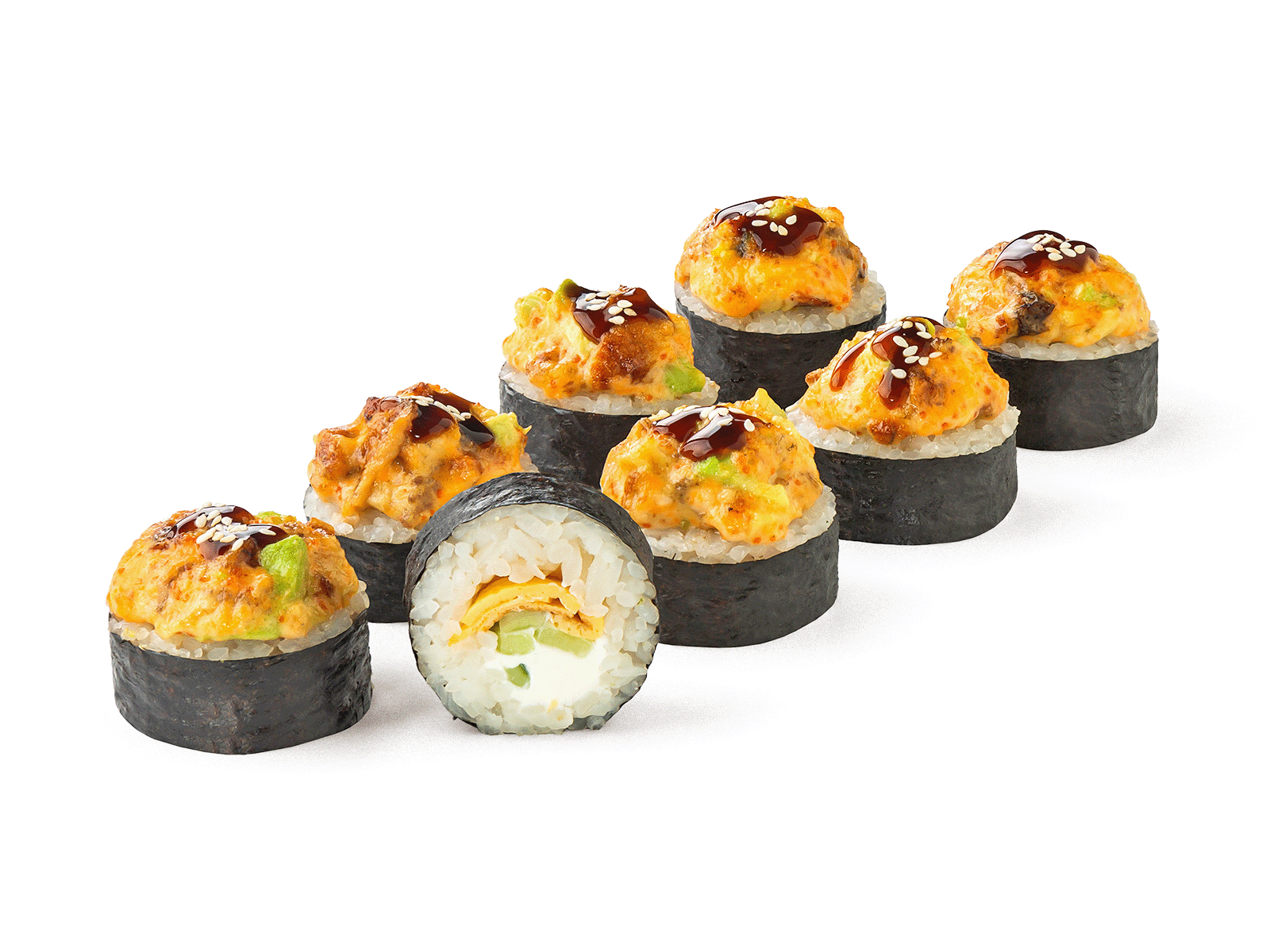 Угорь, авокадо, сливочный сыр, омлет тамаго, огурец, соус сырный, соус Унаги, кунжут. Соевый соус, имбирь и васаби не входит в комплект к блюду