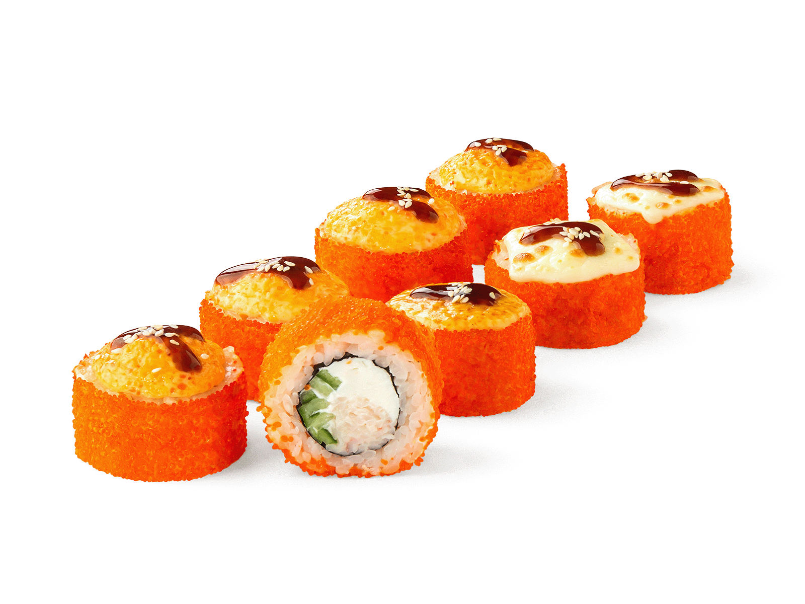 Ролл Калифорния (снежный краб, сливочный сыр, огурец, икра масаго, соус унаги, кунжут) запеченный под 3-мя видами соусов: сырным, розовым, спайси и сыром моцарелла. Соевый соус, имбирь и васаби не входит в комплект к блюду