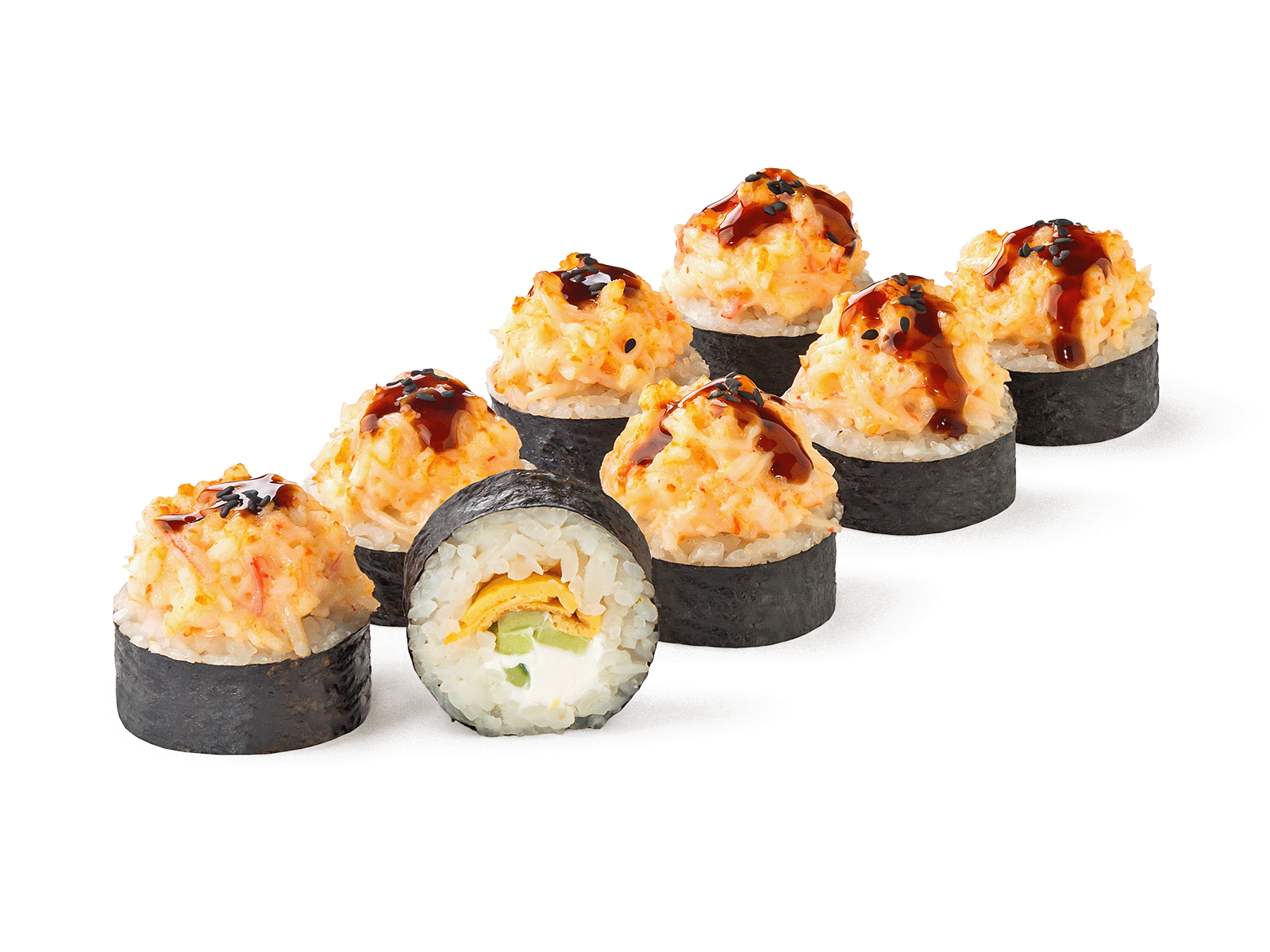 Тигровая креветка, снежный краб, сливочный сыр, омлет тамаго, огурец, унаги-соус, спайси-соус, кунжут. Соевый соус, имбирь и васаби не входит в комплект к блюду