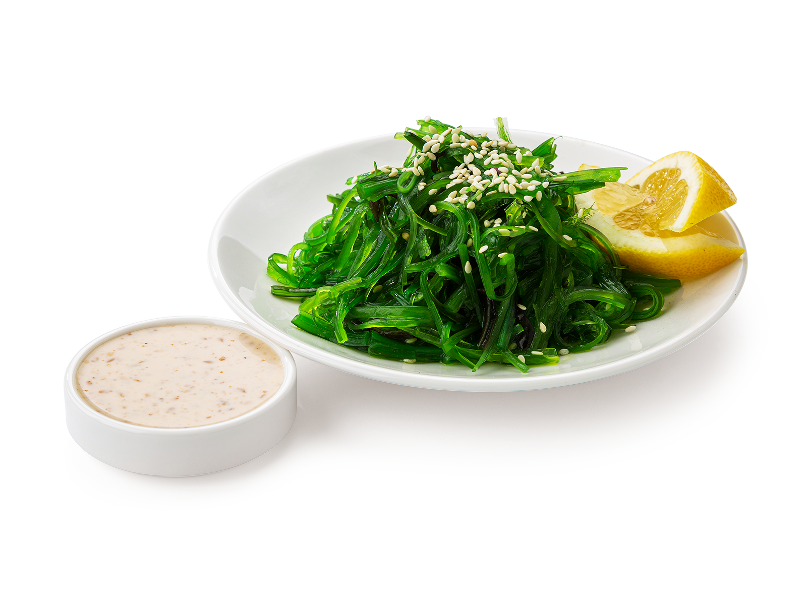 Салат чука, вакамэ, лимон, ореховый соус, кунжут
