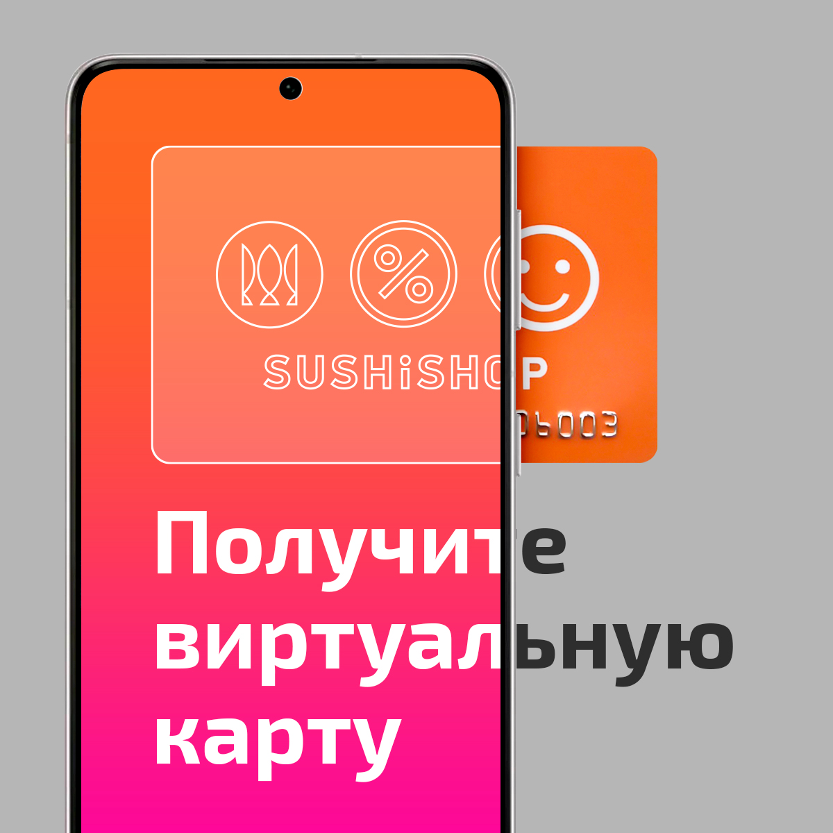 ролл "Филадельфия", суши, наборы, акционные позиции, напитки, а также на аксессуары и сопутствующие товары. Карта действительна во всех магазинах сети СУШИШОП.