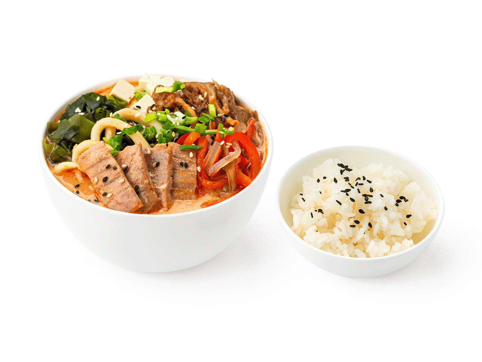 Тунец, кальмар, бульон рыбный, сливки, тофу, вакаме, масло растительное, красный лук, жареные грибы вешенки, болгарский перец, паста кочудян, рис, зеленый лук, кунжут