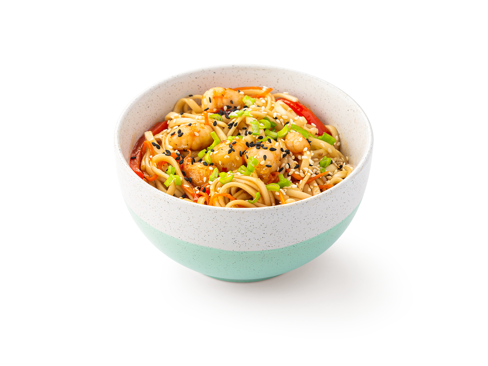 Лапша Удон, тигровая креветка, болгарский перец, кабачки, морковь, красный лук, зеленый лук, соус сладкий чили, соус соевый, кунжут